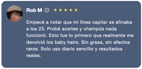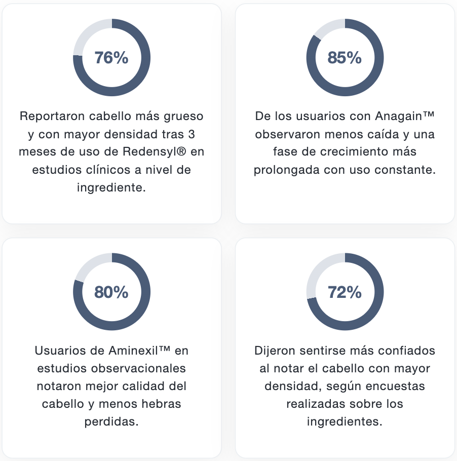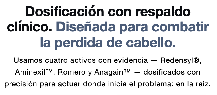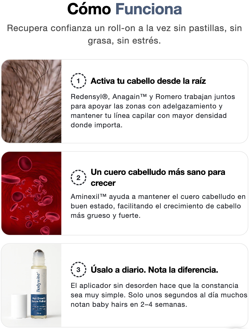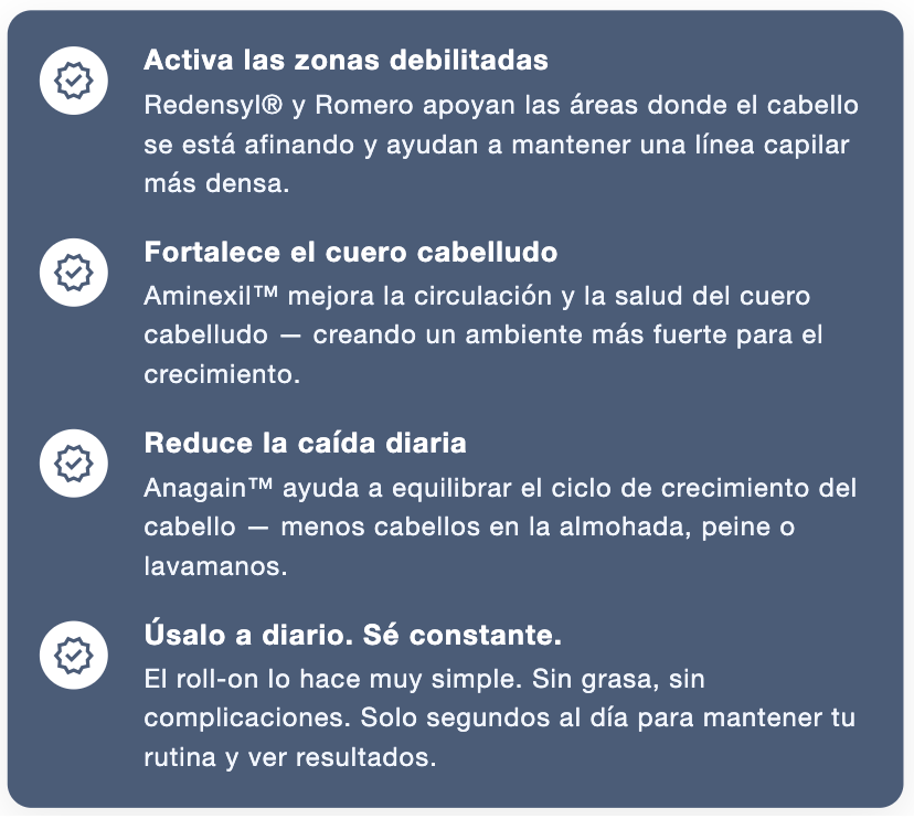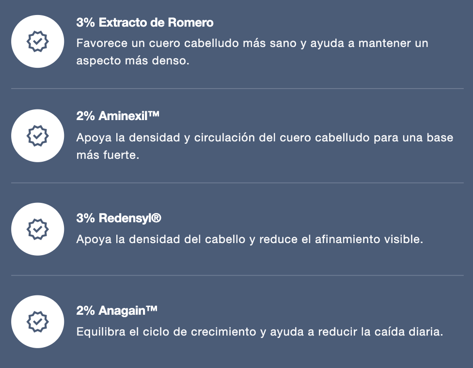 Este suero innovador combina 3% de romero, 3% de redensyl y 2% de anagain, ingredientes que estimulan los folículos pilosos, bloquean la DHT y mejoran el flujo de oxígeno en el cuero cabelludo, promoviendo un crecimiento capilar más denso y saludable.